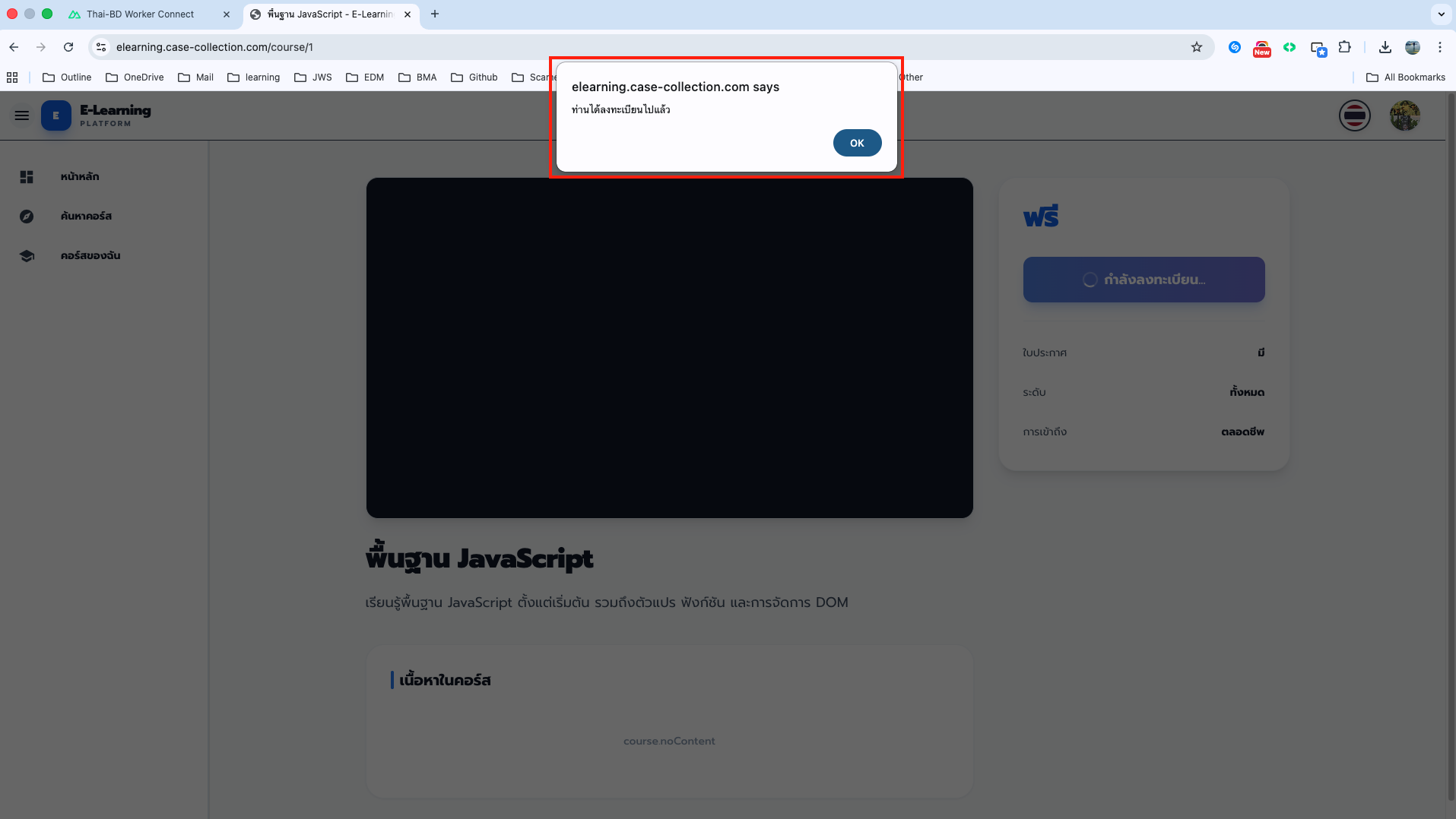 ในหน้าคอร์สทำการคลิกปุ่มลงทะเบียนทันระบบแสดง Pop Up ไม่ถูกต้อง